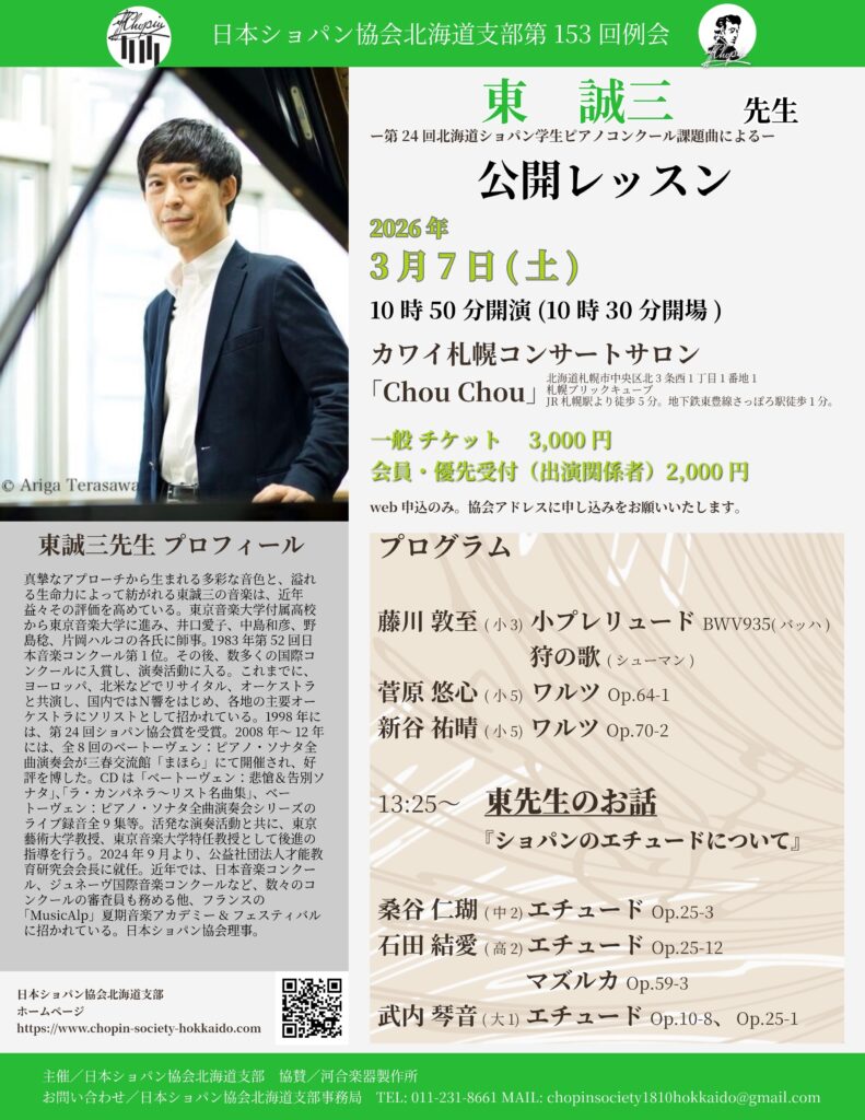 北海道ショパン学生ピアノ開催に先立って、東誠三先生の公開レッスンを開催致します。